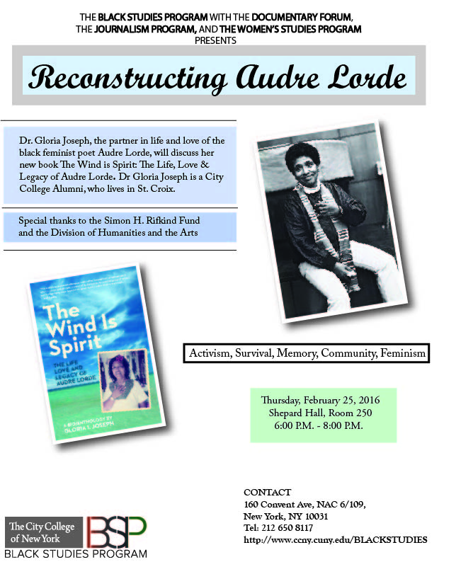 Reconstructing Audre Lorde Posted on February 23, 2016 by Marc Dr. Gloria Joseph discusses the Legacy of Audre Lorde To register for this event, visit: Audre Lorde Event Page Share this: Email a link to a friend (Opens in new window) Email Share on Facebook (Opens in new window) Facebook Share on LinkedIn (Opens in new window) LinkedIn Share on Pinterest (Opens in new window) Pinterest Share on Tumblr (Opens in new window) Tumblr Share on X (Opens in new window) X More Print (Opens in new window) Print Share on Reddit (Opens in new window) Reddit Share on Pocket (Opens in new window) Pocket Like this:Like Loading... Related Post navigation « George W. Woodbey, Black Socialist Preacher36th Annual One Hundred Black Men Gala Recognizes Service »
