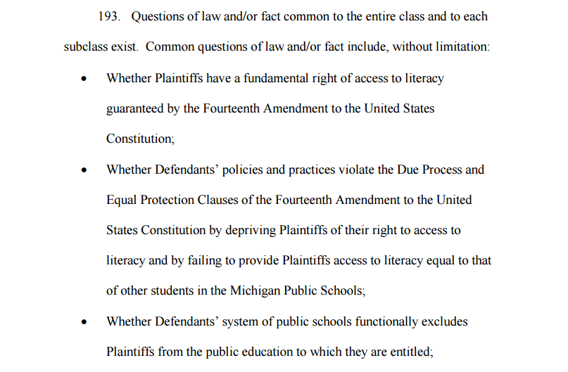 On Tuesday, September 13, 2016 seven students, listed pseudonyms, filed a class action lawsuit against Michigan Governor Rick Snyder, the state Board of Education, state school Superintendent Brian Whiston, David Behen, director of the Michigan Department of Technology, Management and Budget, and Natasha Baker, the state school reform officer. The students are represented by a large pro bono law firm in California, and they are seeking a legal right to literacy under the 14th Amendment