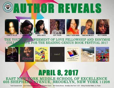 On Saturday, April 8th, the Reading Genius Book Festival will take place from 10am-3pm at the East New York Middle School of Excellence , 605 Shepard Avenue in Brooklyn, NY. The authors scheduled to appear are above.
