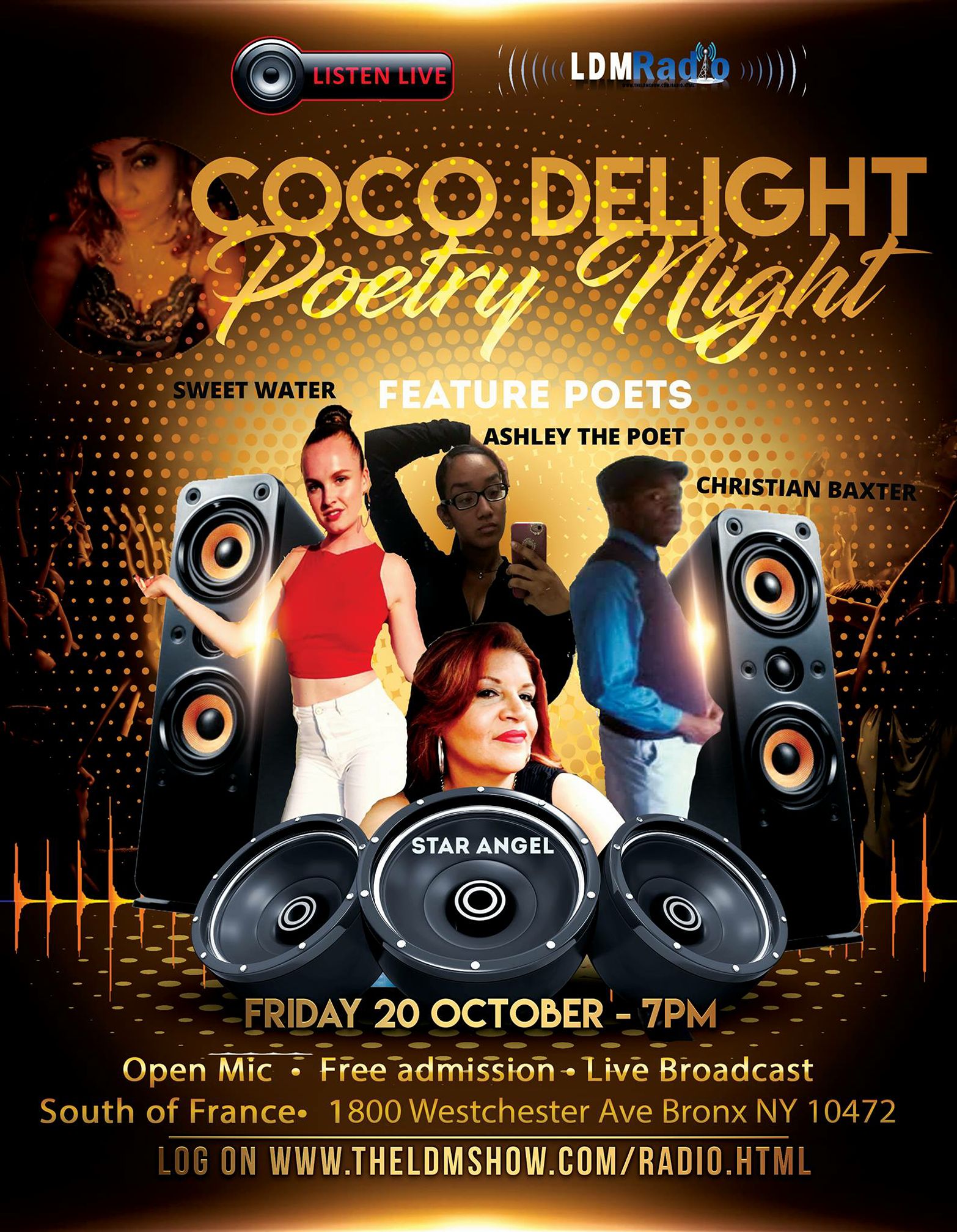 Greetings my readers. As the Fall steadies on, there are a number of events that occur on the NYC literary/poetry scene. I want to let you know about one event that is happening this Friday. Author and poet Keisha Molby-Baez hosts a monthly poetry show called Coco Delight Poetry Night at South of France, a restaurant in the Bronx. Interested poets can sign up to share their work. The show starts at 7pm.
