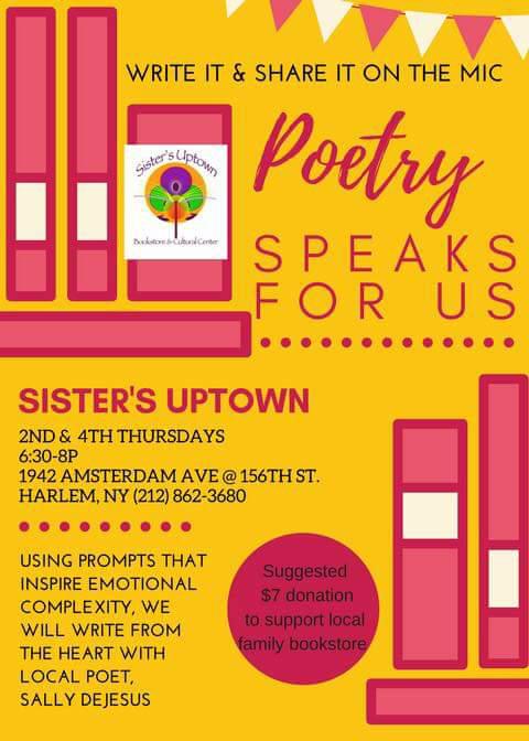 Greetings, my readers. For those of you who are into poetry, and would like to attend a workshop to create, here is your opportunity. At Sisters Uptown Bookstore and Cultural Center this evening, there will be a poetry workshop hosted by Sally DeJesus. Titled “Poetry Speaks For Us”, it is an event where people are given writing prompts, and encouraged to share their work on the stage. It will happen the second and fourth Thursday of the month. Come on through if you are an aspiring, new, or experienced poet.