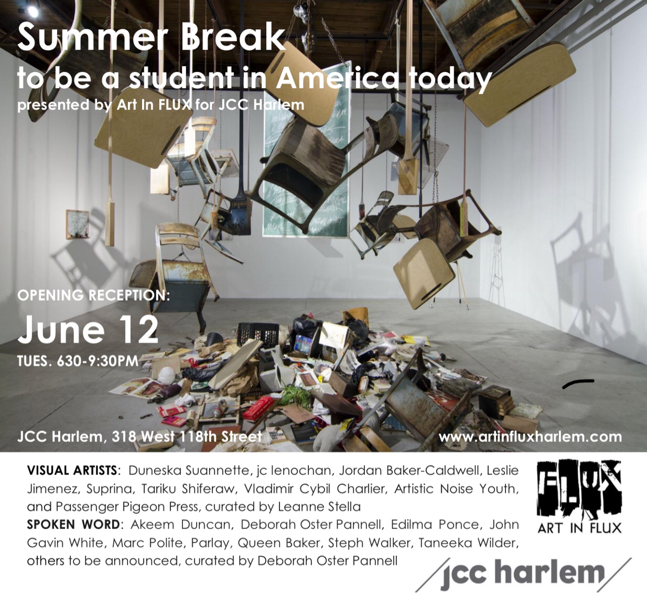 Summer Break, a show of two and three-dimensional mixed media artworks, poetry, and spoken word opens at JCC Harlem on Tuesday, June 12. Summer Break begs us not to forget, as we approach the summer holiday, what it means to be a student in America in 2018. Through installation, interactive works, 2D artworks and performance, this exhibition examines issues that have broken the essence of effective, nurturing education. Seven visual artists and a dozen spoken word artists present a variety of perspectives, some pulling from their days as young students and others as educators in the current environment.