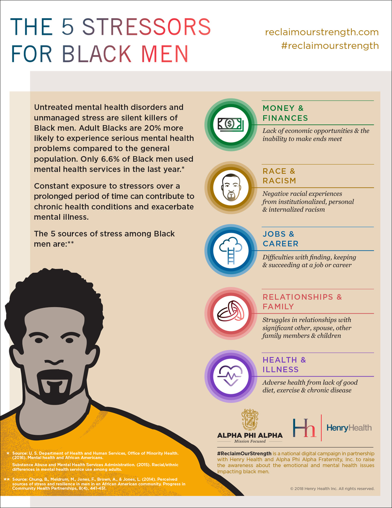 Above is an infograph listing in short The Five Stressors For Black Men. In looking at some of the comments around this information, I have seen some poignant, and searing observations around what it means to be a Black man in these here United States at this time.