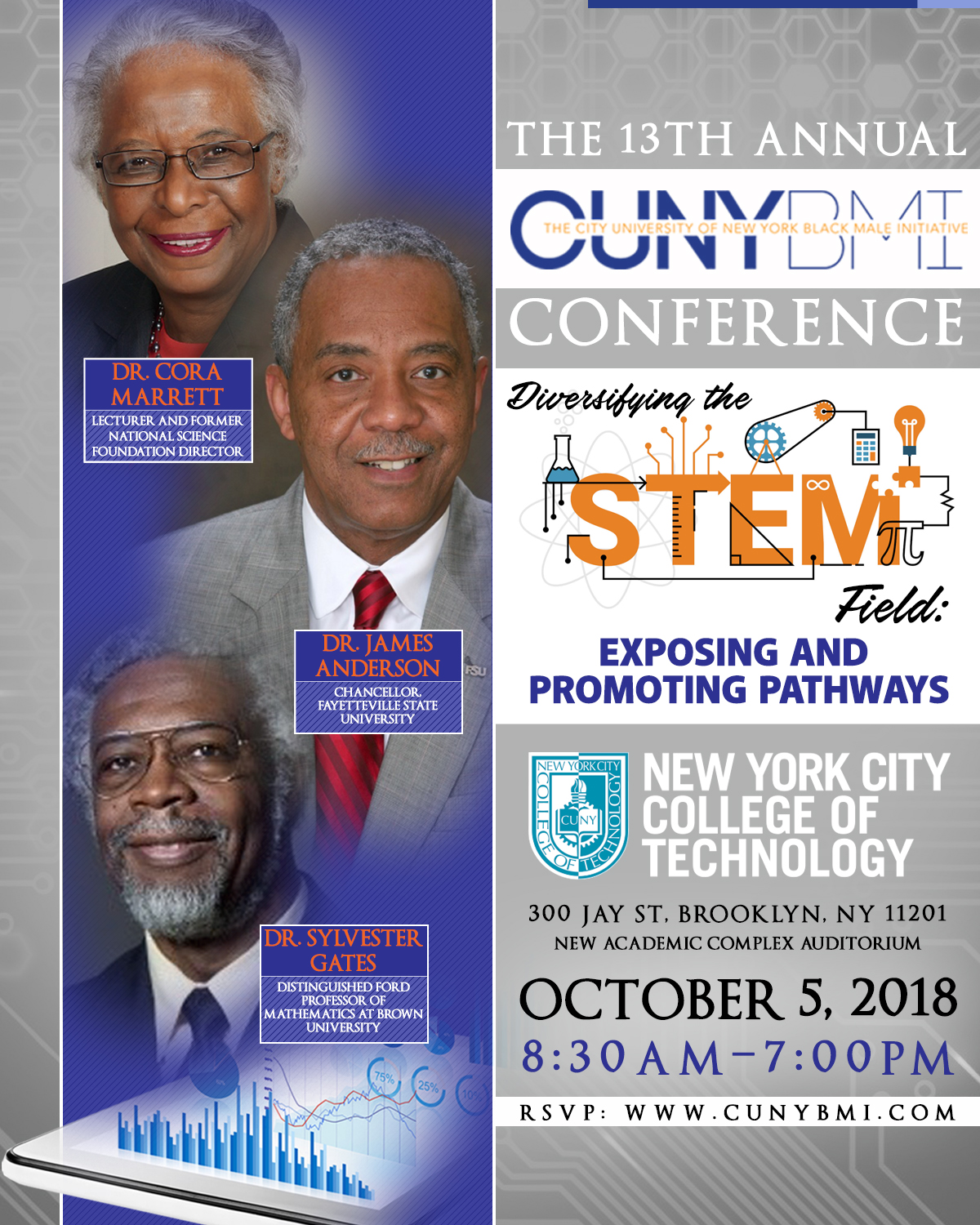 The Thirteenth Annual CUNY BMI conference, “Diversifying the STEM field: Exposing and Promoting Pathways”, will feature a morning keynote by Dr. Cora Marrett, an afternoon keynote by Dr. James Anderson, and an evening keynote by Dr. Sylvester James Gates, Jr. The conference includes morning and afternoon panel discussions that address Women in STEM, Math, Professional Skills Development, the STEM Pipeline, Community involvement in STEM and Careers in STEM. The morning panels specifically will discuss ‘How did we get here?’ detailing the history of STEM as it relates to these topics. The afternoon panels will discuss ‘Where do we go from here?’ detailing innovative strategies as it relates to these topics. The overall theme of the conference will focus on equipping conference participants to enter into STEM fields or find helpful STEM resources to enable other young people begin a career in STEM, primarily young men of color, at an earlier age.
