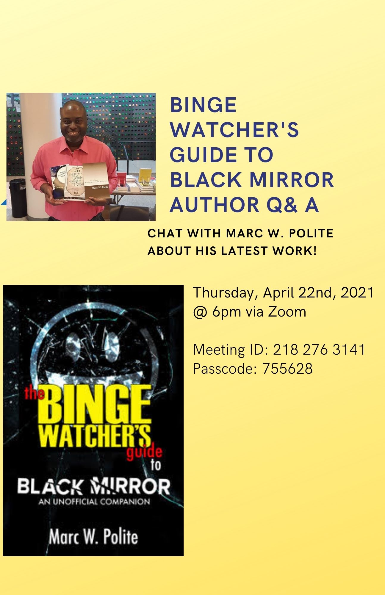Good afternoon, my readers. Next Thursday, there will be an author Q&A for the Binge Watcher’s Guide to Black Mirror. Details are in the flyer above. Stop through virtually if you can. The Eventbrite link is below.
