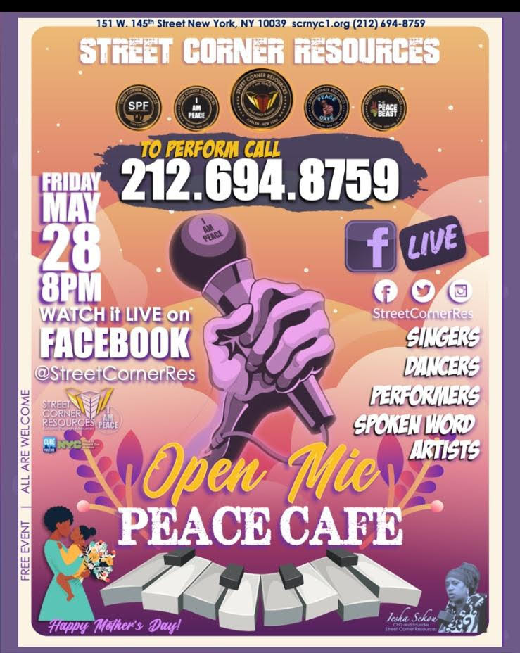 Come join us on Friday, May 28, 2021, at 8 pm as we Livestream the Peace Cafe Open Mic. Singers, dancers, comedians, rappers, spoken word artists, and other performers are invited to showcase their skills in a supportive, family-friendly setting. We look forward to seeing you there virtually!