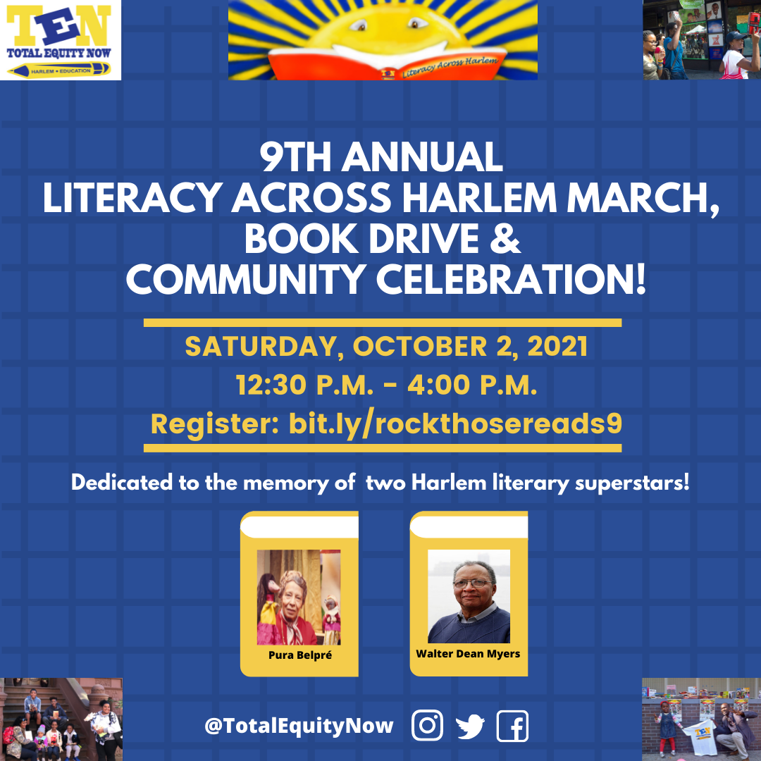 Ninth Annual Literary March Across Harlem- Saturday October 2nd, 2021 Posted on September 20, 2021 by Marc Literacy Across Harlem March Flyer October 2nd, 2021 On Saturday, October 2nd, 2021, the ninth annual Literacy March Across Harlem will take place. It will be dedicated to the memory of Walter Dean Myers and Pura Belpre. Share this: Email a link to a friend (Opens in new window) Email Share on Facebook (Opens in new window) Facebook Share on LinkedIn (Opens in new window) LinkedIn Share on Pinterest (Opens in new window) Pinterest Share on Tumblr (Opens in new window) Tumblr Share on X (Opens in new window) X More Print (Opens in new window) Print Share on Reddit (Opens in new window) Reddit Like this:Like Loading... Related Post navigation « Effective Best Practices for EntrepreneursWhat Does It Mean To Be A Citizen? – October 28th, 2021 »