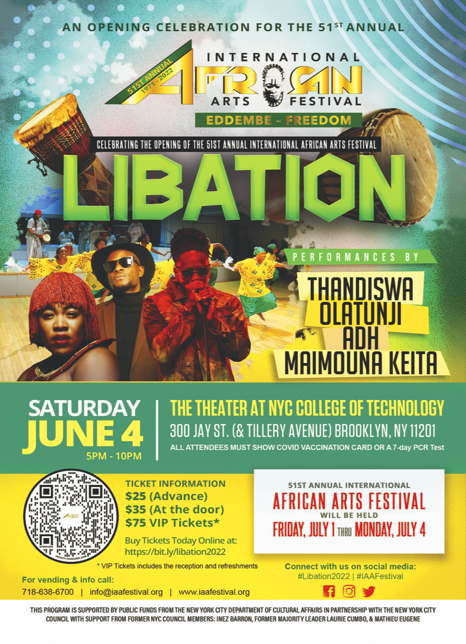 On Saturday, June 4, 2022, the International African Arts Festival, Inc., will be holding their kick-off performance event LIBATION (5:00 pm – 10:00 pm) at NYC College of Technology, giving you a taste of who you will see at the 51st Annual International African Arts Festival.